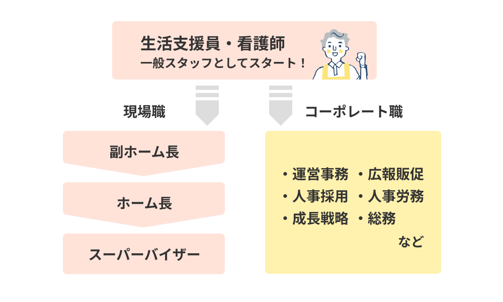 生活支援員職を皮切りに、ホーム長~スーパーバイザーといったマネジメントキャリアや、バックオフィスのキャリア等を選択することも可能です。