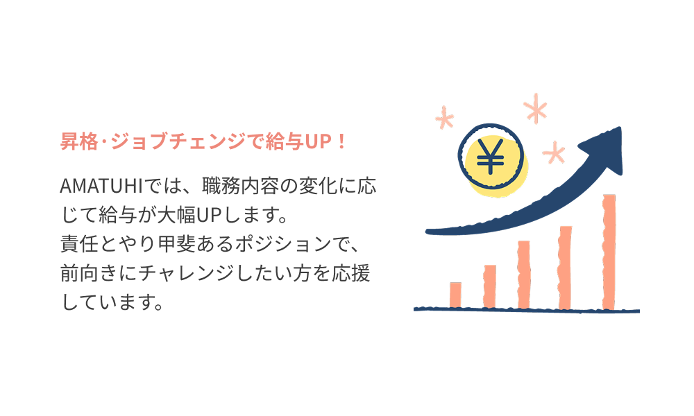 働くモチベーションを高めていただくために、AMATUHIは、頑張った分だけ、給与面でしっかり評価します。スキルアップ&キャリアアップしたスタッフの頑張りや結果に対して、給与面や手当でしっかり評価します。